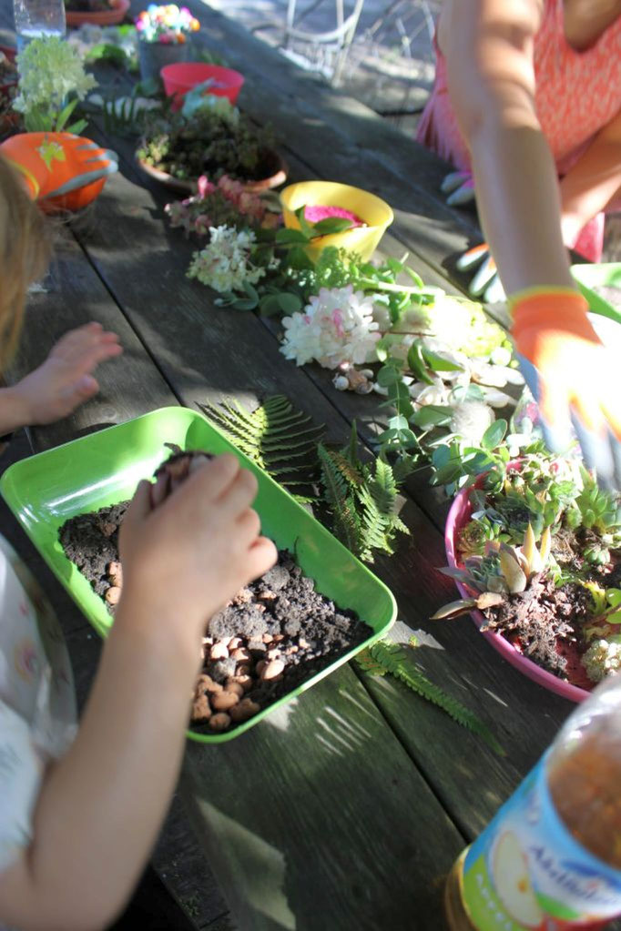 Nun ging es ans kreative Gestalten! An den Basteltischen wartete bereits eine bunte Vielfalt an Materialien: Erde, Moos, Blüten, Hauswurzen, Holz, Steine und natürlich jede Menge Glitzer in allen Farben. Jedes Kind bekam eine kleine Pflanzschale in seiner Lieblingsfarbe und passende Gartenhandschuhe. Dann wurde gefüllt, gepflanzt, modelliert und dekoriert. Aus Erde entstanden Hügel, mit Moos wurden Wälder erschaffen, es entstanden glitzernde Flüsse und geheimnisvolle Landschaften, in denen sich Dinos und Feen tummelten. Mit großer Hingabe und Fantasie gestalteten die Kinder ihre ganz eigenen Miniaturwelten – jede einzigartig und liebevoll gemacht.